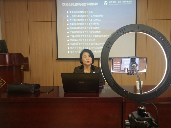 此次活動(dòng),特邀溫州市十佳律師、溫州市政府行政法規(guī)合法性審查專家周春萍律師開展直播。直播以公司法律風(fēng)險(xiǎn)防范為主題,以企業(yè)法律案例分享了合同審查、員工社保、競業(yè)禁止協(xié)議等方面的法律風(fēng)險(xiǎn)。